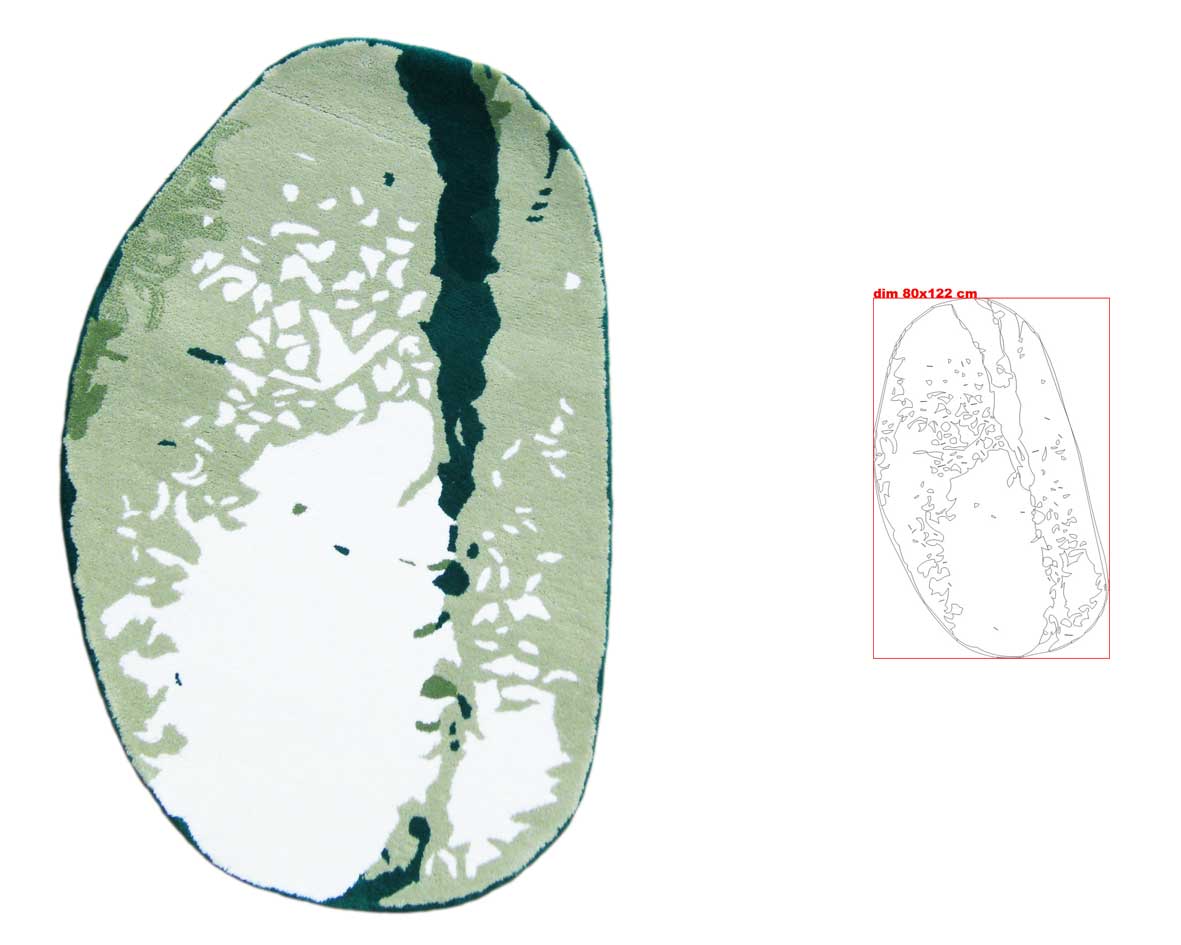 design Studio Art Fabrica • NOTE TECNICHE > Composizione vello: 100% Lana (blended, Nuova Zelanda + Bikaner) - Finitura del dorso: fondo rivestito in tela Costruzione: handtufting (trapuntatura manuale) con tecnica cut pile (pelo rasato). Altezze nominali (pelo): 15mm Spessore del manufatto (max):circa 2 cm Densità (solo fibra): Kg/m2
